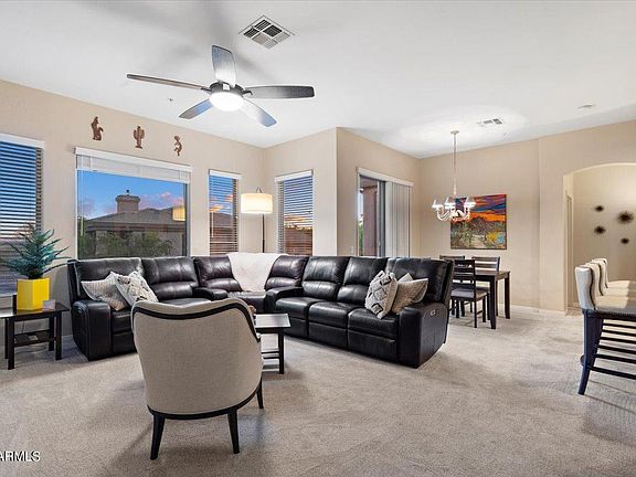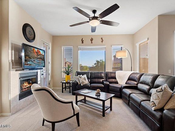 Enjoy the beauty of the scenic, peaceful surroundings in McDowell Mountain Ranch. Meticulously Maintained, End Unit with City Lights, Mountain Views and walking distance to restaurants, shopping and hiking trails! This condo is perfect for winter visitors or year-round resident. Step inside to find a large dining and living area with neutral paint throughout and cozy fireplace. The home has been recently updated with a new HVAC (2020), water heater (2020), soft water loop (2021), stainless steel oven, refrigerator, and microwave (2018), bath fixtures (2020), wood blinds (2021), and ceiling fans (2020).This gated community has a pool, spa, fitness center and outdoor BBQ's. Residents also enjoy all the McDowell Mountain Ranch amenities-pools, tennis courts & playgrounds. All TV's convey. WOW