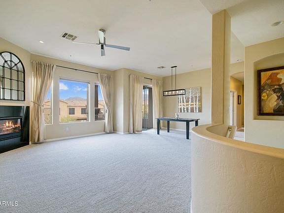 Amazing Views & Prime location! This turn-key 3 bedroom condo has all updated appliances, window treatments, plantation shutters, brand new paint and carpet. The split master suite includes a private balcony, tiled shower/garden tub and huge walk-in closet. Second bedroom also includes walk-in closet. The open great room design has a gas fireplace, upgraded lighting and fans, 10 ft ceilings and large balcony overlooking a wash with city and mountain views. Eat-in kitchen with upgraded cabinets, pantry, granite countertops, tiled back splash and separate laundry. Direct entry from 2 car garage. This gated community has a heated pool and spa, fitness center, minutes to stores and restaurants, and is surrounded with hiking/walking trails.
