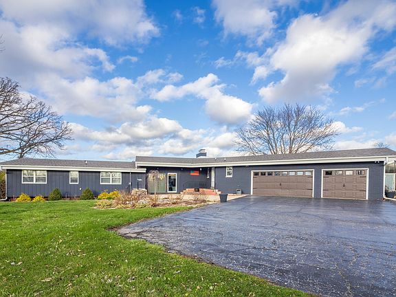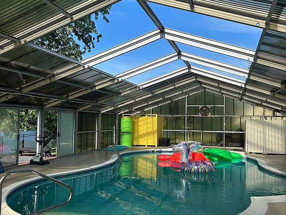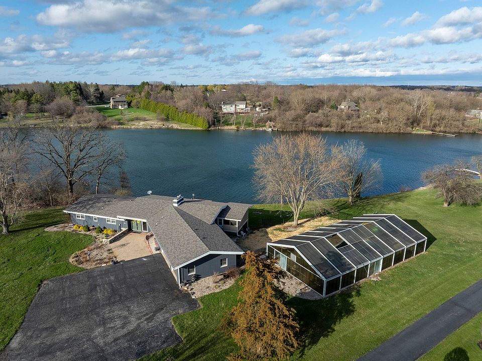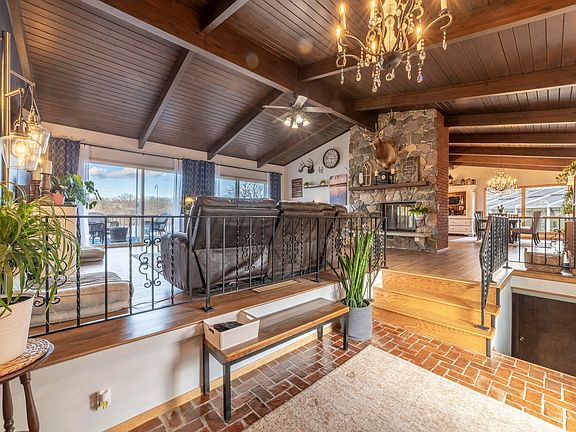 Enjoy LAKEFRONT LIVING in this Beautiful RANCH Home with a WALKOUT BASEMENT! This sprawling 4 bed, 3 and a half bath ranch sits on just over 1 acre, overlooking the private Lake Julia. Walking in main floor boasts an eye catching double sided, wood burning fireplace. New premium waterproof laminate flooring. Newly remodeled GOURMET KITCHEN featuring CAMBRIA quartz countertops with 9ft waterfall island and maple wood cabinets. This home also features: Vaulted custom wood ceilings. Lake view primary with on suite and private balcony. New roof 2024, updated dual zone HVAC and water heater. On the lower level you'll find a large additional living room with gas fireplace, 4th bedroom, 3/4 bath and future rec room. The basement level would be the ideal set up for a separate related living space! This home offers storage beyond storage with its 13 closets and basement areas. Let's talk about outdoor living space! Large deck overlooking the water and screened porch off the kitchen. OH AND THE POOL, and the year round pool parties in the huge heated in ground, enclosed oasis.
