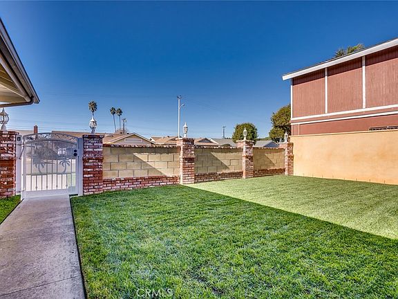 This lovely beach home resides on a quiet cul-de-sac, while offering really nice curb appeal and plenty of quality upgrades. As you drive up, you are greeted by a well manicured front lawn and a private front court yard. Once inside, there is a large dining area to the right, adjacent to the kitchen. The kitchen offers updated cabinetry, Corian countertops and stainless steel appliances with a built-in microwave. Next comes the formal living room with a slider to the rear patio + plantation shutters. The hall bathroom has an updated shower enclosure and vanity. The bedrooms are all nice sized and come with mirrored closet doors + carpeting. The primary bedroom is separated from the other bed's and offers an updated primary bathroom. Bonus features include; smooth ceilings, crown moldings, plantation shutters, new interior doors, wood and tile flooring, dual pane windows & slider, updated copper plumbing, a new front door and security screen, newer heating & A/C, rain gutters plus the garage comes with built-in cabinetry, pull down storage access, an electric screen and an epoxy floor. There is also a very private rear yard with a large patio, lawn, storage shed, timed sprinkler system and block wall fencing all around. This fabulous home is walking distance to award winning schools, a park, golf, shopping, restaurants and is only a 5 minute drive to the beach or the Bella Terra Mall!