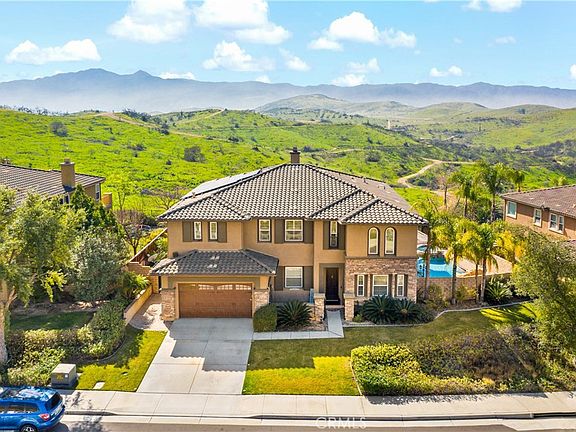 Absolutely Stunning Pool Home with Spectacular Views in Lake Hills Reserve! Welcome to your dream home in the highly desirable Lake Hills community, where luxury meets functionality! This exquisite property features completely paid solar and an array of upgrades that will leave you in awe. Spacious Living With 4,895 sq ft of elegance on a 16,553 sq ft lot, this home is designed for comfort and entertainment. Grand Entry & High Ceilings, Gorgeous Interiors, Enjoy a stunning living room complete with a double-sided fireplace that flows seamlessly into a formal dining area adorned with a beautiful stacked stone accent wall. Exquisite hardwood flooring and elegant crown molding throughout add to the charm. Gourmet Kitchen featuring granite countertops, a large island, ample cabinets, a butler's pantry, stainless steel appliances, and double ovens, all overlooking the cozy family room with a built-in entertainment center. The home includes a full bedroom and bathroom on the lower level. Upstairs, discover a grand loft, a spacious Jack & Jill bedroom setup, and a rear ensuite bedroom. The master suite is a true retreat with a private patio, cozy fireplace, massive two walk-in closets, and a spa-like bath featuring a separate tub and shower, along with a built-in vanity. Outdoor Oasis, Step outside to your entertainer’s paradise! A stunning pool and spa with a flowing waterfall, built-in BBQ, fire pit, and breathtaking mountain views await you in the manicured backyard. Living in Lake Hills Reserve means enjoying the tranquility of a mountaintop locale away from city life while being close to Riverside's cultural and educational amenities, along with shopping attractions close by. The guard-patrolled community offers exclusive access to a private residents' club, complete with a swimming pool, playground, park, open-air fireplace pavilion, and is in proximity to the highly rated Lake Hills Elementary School. Don’t miss your chance to own this luxurious sanctuary with an unbeatable lifestyle! Schedule your private showing today and experience the splendor for yourself!