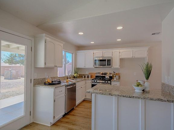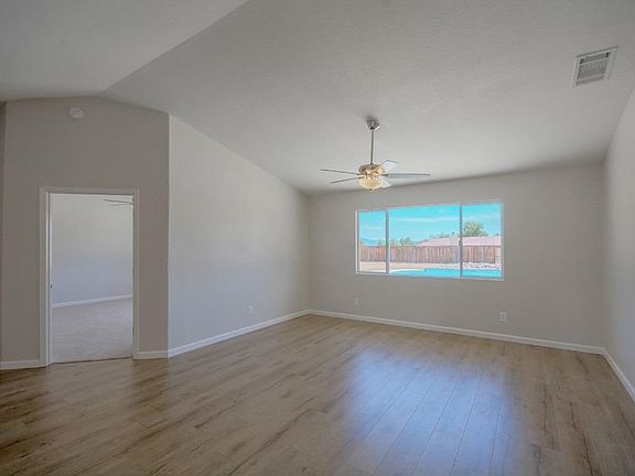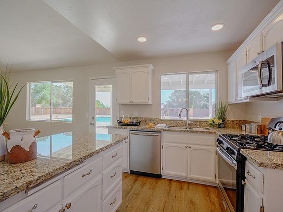 Renovation just completed on this POOL HOME just in time for summer enjoyment. This home boasts an open floor plan with all new flooring, fixtures, appliances, interior and exterior paint, THE WORKS! Wood laminate flooring in main areas. Master bathroom has wood look plank tile flooring. All counters including in the laundry have been freshly upgraded with granite counter tops. Bedrooms have new carpet. All lighting has been upgraded. This floor plan includes both formal and informal dining, as well as a living room and family room. The large formal living room would be ideal as a game room, media room with sectional sofa, etc. Master suite is arranged with dual closets including a large walk-in closet between the sleeping quarters and the bathroom. Dual sink arrangement in the master vanity area. Indoor laundry with granite counters and storage cabinets. Huge lot fully landscaped with desert maintenance and water conservation in mind. Lots of space for parking, gazebos, shade structures, putting in a storage shed for all the pool toys, etc. Tons of space affords you tons of possibilities. This home is located in an established 'curb-and-gutter' neighborhood. No HOA dues!