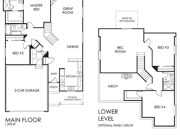 The Princeton is an open-concept ranch floorplan that offers a practical and comfortable approach to modern living. The main level offers access to the dining room, laundry, master suite, an additional bedroom and bathroom, and a standard patio. The large dining room offers a perfect place to gather around the table, while the adjacent kitchen and great room with an optional fireplace adds comfort and convenience. The large kitchen and peninsula bar gives you ample counter and cabinet space. Homeowners who choose to finish the basement will enjoy a large rec room, two additional bedrooms, one bathroom and an unfinished storage area. A spacious 2-car garage comes standard. The Princeton can be fully finished to include up to 4 bedrooms and 3 bathrooms. Popular design options for the Princeton include an optional great room fireplace, optional extended front porch and back patio/deck.