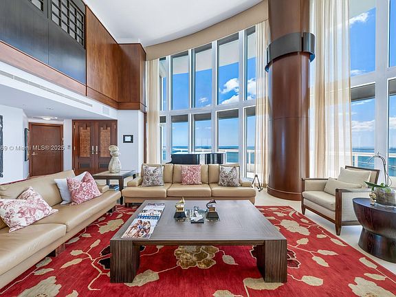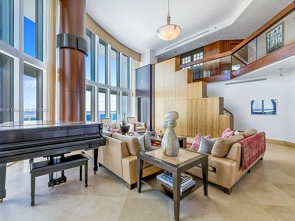 Discover this stunning 2-story corner residence at the iconic Santa Maria in Brickell. This sky-high home features an expansive wraparound terrace with sweeping ocean and bay views. Enter through a private foyer to walls of glass framing dazzling water vistas, and entertain with ease across multiple living and gathering spaces. The gourmet kitchen, with Gaggenau and Sub-Zero appliances, flows seamlessly into the dining area. The lavish primary suite offers a walk-in closet and spa-like bath with stone finishes, rainfall shower, and jacuzzi tub. Additional highlights include a soundproof movie theater, versatile den, high-end finishes, 3 parking spaces, storage, and more. Residents also enjoy newly reimagined amenities including a state-of-the-art fitness center, pool, tennis court, & more.