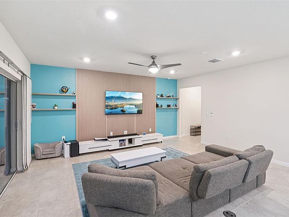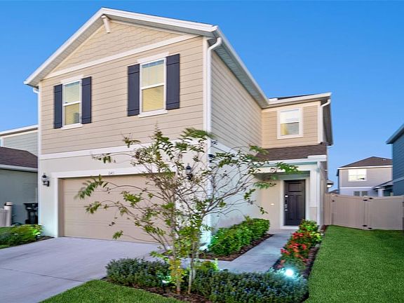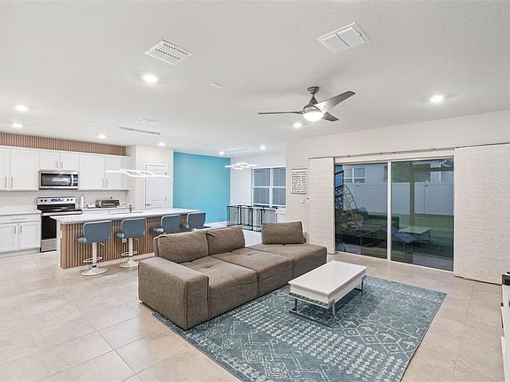 Welcome to this beautifully updated home offering modern style and thoughtful upgrades throughout. Enjoy the benefits of new construction without the wait or the mess. Bright, open living spaces feature designer vinyl panel accents in the living room and on the kitchen island, along with modern light fixtures and recessed lighting for a clean, contemporary feel. The kitchen includes stainless steel appliances, white cabinetry, oversized island and ample counter space, making it ideal for everyday living and entertaining. The second floor features freshly painted interiors and new stylish vinyl flooring throughout the stairs and loft area, creating a sleek, durable, and low-maintenance finish. A spacious loft provides flexibility for use as a media space, office, or lounge. Enjoy indoor-outdoor living with sliding doors leading to a screened lanai overlooking a private vinyl-fenced backyard with two gates. Additional features include accent walls, architectural details, and ceiling fans throughout. Located in a growing Four Corners area with convenient access to shopping, dining, major roadways, and nearby Central Florida attractions, this home provides comfort, convenience, and modern finishes in a prime location. Community features a oversized community pool with outdoor entertaining space and community playground. HOA fee includes high speed internet and TV.