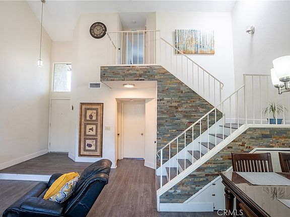 Welcome to this bright and spacious townhome in the highly sought-after Laurel Wood community. The home features soaring ceilings and a skylight that brings in abundant natural light, creating an open and inviting atmosphere. Recent updates include new carpet in the bedrooms, freshly painted cabinets, and a newer AC unit for added comfort. The thoughtful floor plan offers a bedroom and full bathroom on the main level, with an additional bedroom and full bathroom—including a vanity area—upstairs. Enjoy the convenience of direct garage access and an assigned parking space. The living room opens to a private patio, ideal for relaxing or entertaining. The community is beautifully maintained and includes a pool, lush greenbelts, and roofs that were replaced just 2.5 years ago. Located near the 15 freeway and close to shopping centers, this home is a great value with a low HOA