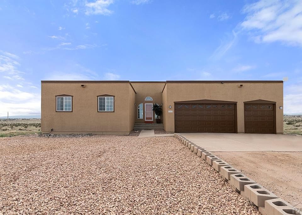LOCATION! LOCATION! LOCATION! This home is in an amazing spot with a Private Reserve out back, and a Privately own ranch out front! What amazing views! Over an acre, and what a haven. This contemporary Sante Fe Style home has many extra features, such as a Walk-out basement with 2 (two) accesses; deck access off the master; a 2-tiered back patio/deck, and brand new high-quality granite. The condition of this home is like brand new! The gourmet kitchen has a 5-burner gas stove and a gorgeous pounded copper farm sink! Enjoy the VERY peaceful and quiet location and its AMAZING sunsets right out back with unobstructed views of the ranges and of Pueblo West. The garden is ready and full for your enjoyment including a drip system. The home has a wonderful open floor with a lot of natural light that accentuates the Brazilian hardwood floors throughout. The vaulted ceiling and the custom room-centered fireplace adds a lot of character and comfort. Schedule your showing today and place your Offer on the home with an amazing and rare location. This location hardly ever comes available! So much of this home is NEW! (The new(er)(2017) membrane roof had polyiso insulation added to increase the R-Value to 9-13.)