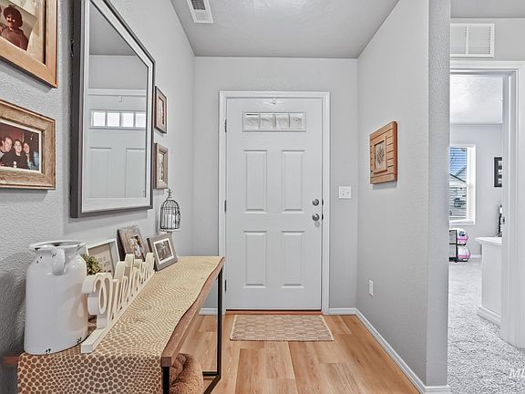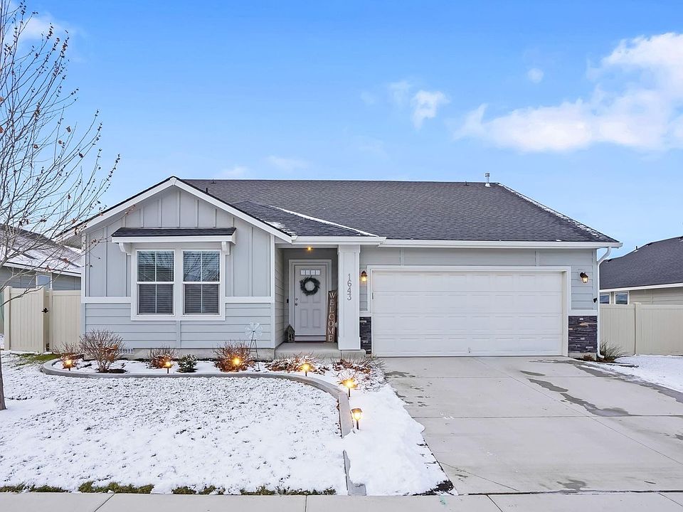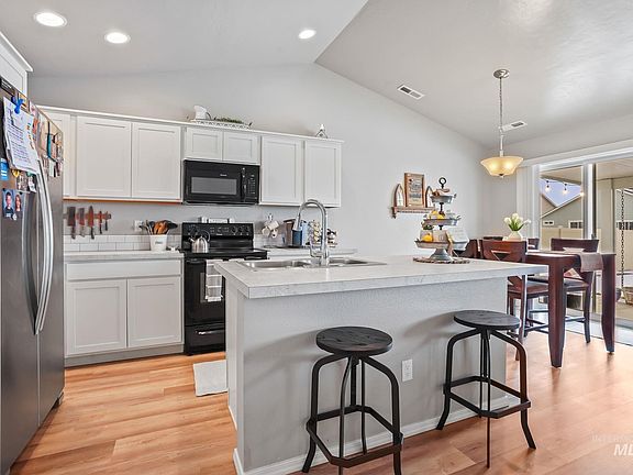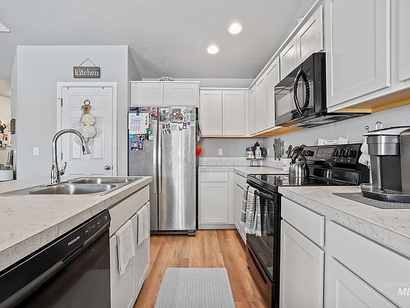 Don't miss this beautiful 3 bedroom, 2 bathroom, like new home in a desirable Kuna community! This single level home greets you with an entry way that opens up into an open concept kitchen, dining and living room with vaulted ceilings. Beautiful white cabinets with subway title backsplash, kitchen island and plenty of counter space throughout the kitchen. Sliding door leads to a covered patio, backyard with new curbing and established landscaping. Generous sized master bedroom on opposite side of the home for plenty of privacy. Dual vanities in master bath and a walk in closet. 2 additional bedrooms on the opposite side of the home offers a split bedroom floorplan. Why wait for new construction when this home offers everything? (High quality blinds throughout, auto sprinklers in front and back yard, full fencing and established landscaping). Schedule a tour today and don't miss out on this beautiful Kuna home!