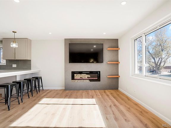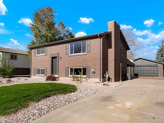 Come check out this lovely remodeled home in Northglenn. 1643 Truda is situated on a quiet street and has a sunny and bright southern exposure, bathing the interior in light. The exterior is low maintenance brick and the roof on the main house is new. There is a newer sewer line with cleanouts in the front yard. The massive driveway is perfect to house additional guests or vehicles. Adding to that is the huge 725 SQFT garage which has its own breaker panel, perfect for storing both vehicles and housing a workshop simultaneously. The large 9100 sqft lot gives you plenty of space to design around. The backyard is a blank slate, add raised garden beds, play equipment, grass, or keep it mulch for a low maintenance solution. The large 200 SQFT covered patio with lighting is perfect for that exterior living space or outdoor entertaining. Inside is where the property truly shines, with a fun eclectic design, this home is sure to stand out. Step inside first to see the soaring slat wall adding a touch of warmth to the space. The kitchen is an airy departure with sand cabinets and custom white and brass appliances paired with a clean white quartz countertop. Massive built in peninsula was designed to seat up to seven. The built in fireplace adds a touch of mid century charm with its monolithic design and offset African mahogany floating shelves. Both bathrooms boast bold 3D tiling and touches of color. Relax in the basement rec room that feels so bright most days you'd swear you were on the second story. The large wood burning fireplace anchors the room and even has an air circulator to move the warm air into the space. This home also features a newer high efficiency Trane furnace and air conditioner and it has a new electrical panel.
