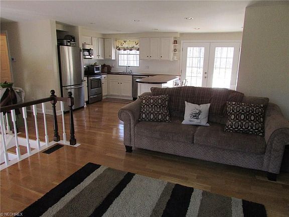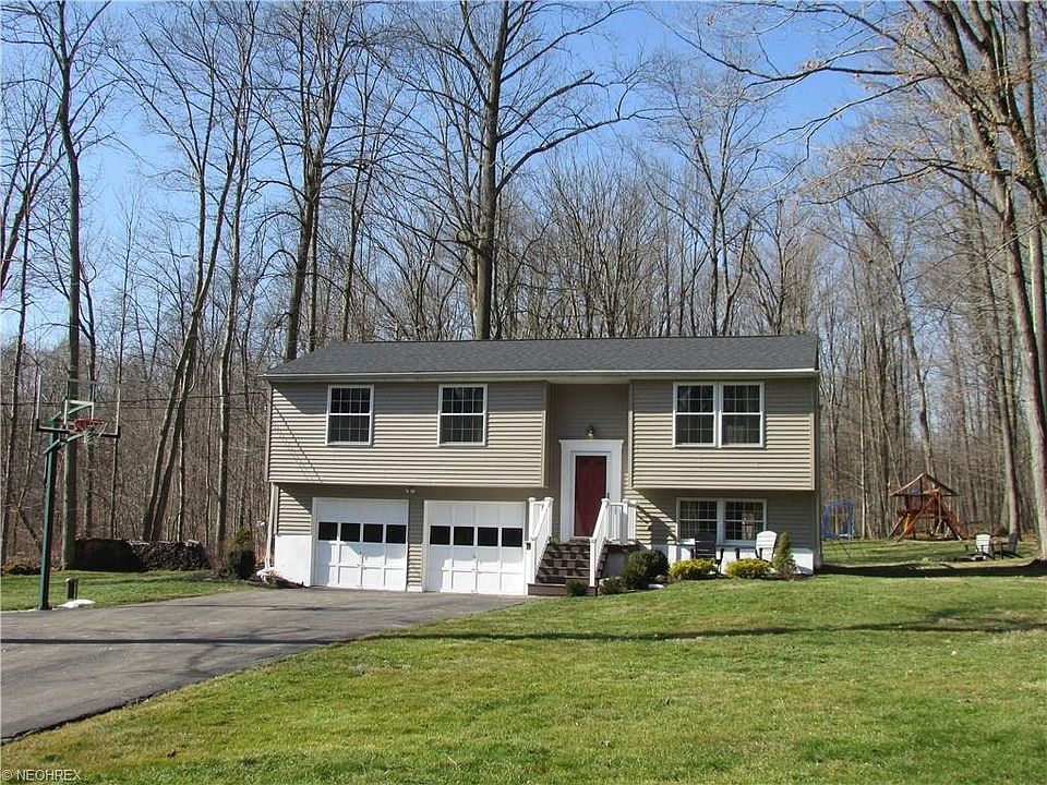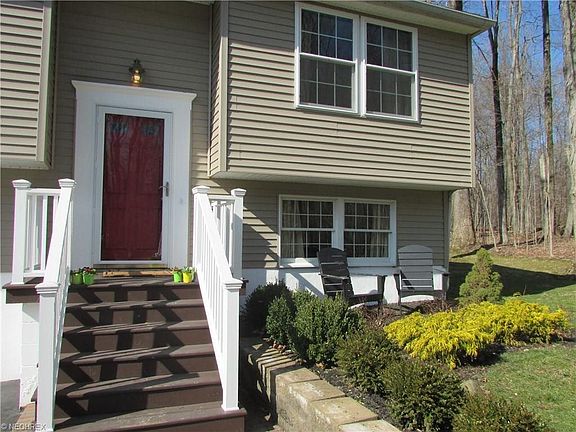 One and a half wooded acres in Geauga County. Meticulously cared for and maintained raised ranch with three bedrooms, one and a half bathrooms. Kitchen updated with handsome walnut butcher block countertops, hardwood floor and stainless steel appliances. Breakfast room with tall pantry cabinet and glass doors to deck. Family room with hardwood floor open to kitchen. Newer windows allow lots of natural light. Finished lower level perfect for media room and exercise space, complete with half bath. Enjoy this beautiful setting from deck or deep backyard with fire-pit. Two car attached garage and storage shed. Long list of improvements available with brochure. Easy access to Route 422. Seller will leave funds in escrow for possible replacement of septic system or repairs, if required by county.