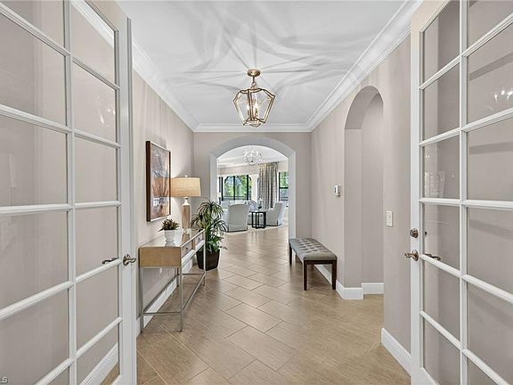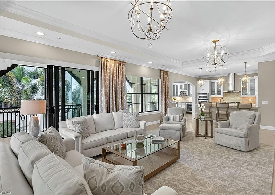 IMMEDIATE GOLF MEMBERSHIP AVAILABLE AT CLOSING! Skip the waitlist and start enjoying the award winning Greg Norman/Pete Dye designed course at TALIS PARK! This captivating TURNKEY condominium features a GOLF COURSE VIEW overlooking holes #4, #3 and #2 and the sparkling lake, a timeless primary suite with hardwood floors in the bedroom and in the custom closet, dual sinks, a bathtub and separate large shower. The captivating great room is impeccably decorated in a neutral decor which blends seamlessly with the soft white cabinetry in the chef inspired kitchen. A natural gas cooktop is a bonus as is the built in bar with both a wine and beverage refrigerator. Two ensuite guest rooms, a den/office with warm hardwood floors/private screened balcony and a lovely powder room combine for a condominium that lives like a true home with 2950 SF of air conditioned living space! The 700 SF wraparound screened loggia can be accessed from the corner sliding doors in the great room, the kitchen or the primary bedroom creating a perfect place to bring the outdoors inside while entertaining a group, dining al fresco or enjoying your morning coffee! An additional storage room in the garage is fitted with a dehumidifier. Two deeded garage parking places are also included in this graceful "lock and leave" residence. Carrara residents and their guests have the use of the private pool on the street and the grill area. In addition to the spectacular golf course, Talis Park residents enjoy the award winning clubhouse (formal and informal dining), Fiona's casual dining with a pizza oven, the Casa Cortese at the practice range with an outdoor bar and indoor golf simulator, fitness center, spa, bocce, pickleball, tennis, two dog parks, a large community pool, playground and peaceful walking/running paths. The expansive social calendar is sure to impress with something for everyone. Located between Olde Naples and RSW Airport, it's a premier locale. Shopping, dining and beaches are also in close proximity.