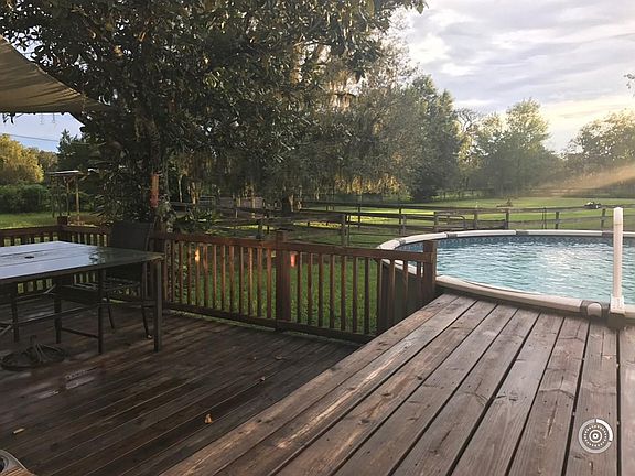 Come home to this peaceful, country living paradise. Roomy and cozy fully furnished 3/2 home. Spacious kitchen. Living room has two brand new sleeper sofas. Two rooms have brand new double full size bunk beds. Master has one brand new queen size bed. Master has its own private bathroom with walk in closet and roman tub. This home is nestled among beautiful mature oak trees. Has a new wooden deck and extra large above ground pool. Complete with laundry room / washer / dryer/ microwave / electric range / fridge. 5 acres of fully groomed land with a firepit and gazebo. Long paved driveway leading to the main house. Large storage shed for RV parking. Horse paddocks. Yard is private and fully fenced. Bring the horses. Lease includes grass cutting, pool cleaning, garbage pick up.
