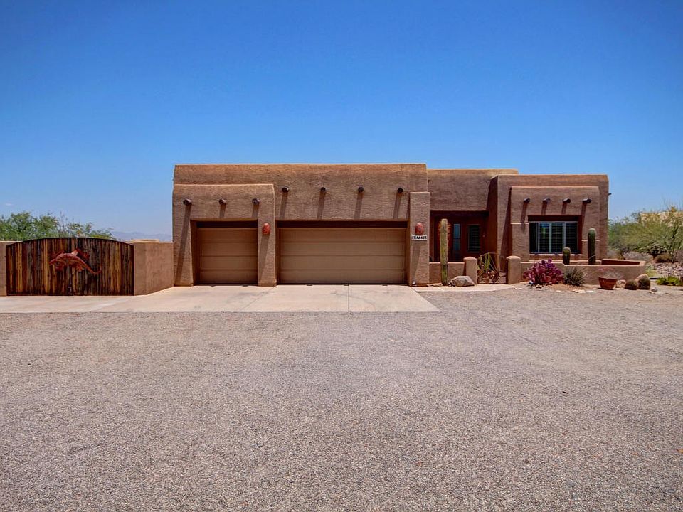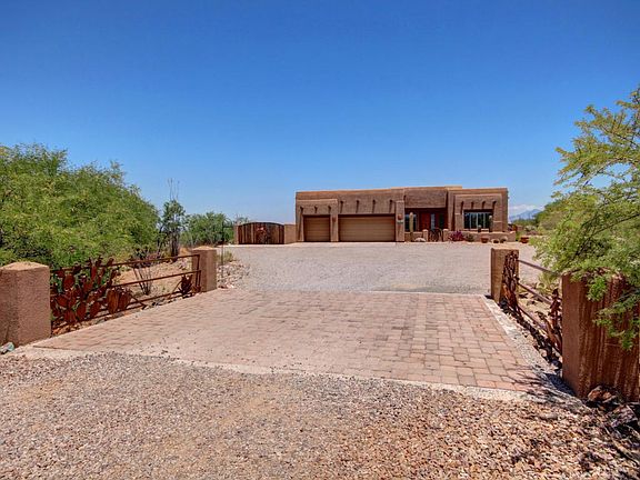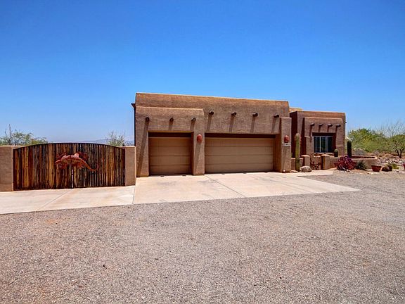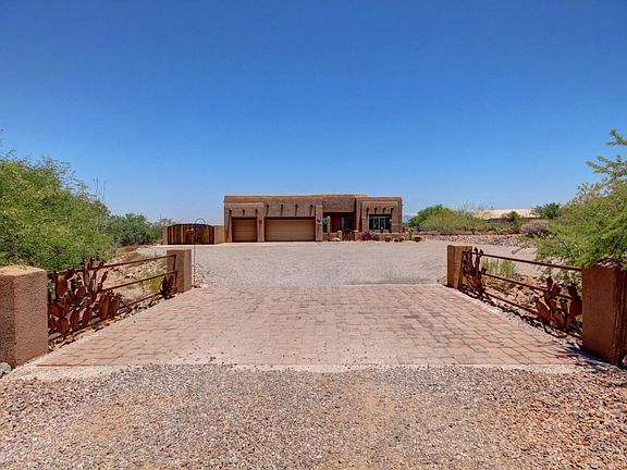 Outstanding Territorial Home nestled on over two acres. Soaring ceilings, warm palette, plantation shutters, upgraded lighting/ceiling fans, and tile floor. Spacious open floor plan features 2 center kitchen islands, granite counters, tiled backsplash, breakfast bar, SS appliances, pantry, patio access, and wood cabinetry. Perfect Home for entertaining inside and out. Carpet and hardwood floors in all the right places. Generous size bedrooms with lots of character, ample closets, and 2 baths. Peaceful & serene Tahitian style backyard boasts covered tiled patio, sparkling pool, spa, thatched Gazebo covered built-in BBQ area, RV area with hook-ups and view fence overlooking the natural desert with Mountains reaching to the sky! Will NOT last! Come. See. Stay.