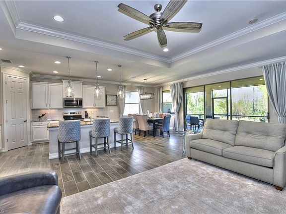 West of 75 for under $450,000? Yes you read that right! Barrington Cove is a hidden gem, located next to exclusive communities like Talis Park and Mediterra, this Livingston Road community offers gated living with extremely low HOA fees. This Edison model home by DR Horton offers split living with the 2 guest bedrooms and bath at the front of the home offering separate privacy for the Master Bedroom. Upgrades abound including designer finished walls in the master and great room with tile throughout (except the guest bedrooms). The kitchen features beautiful Ocean Beige Granite with glass subway tile back splash and 42" maple cabinets. 7" crown moulding throughout really shows the volume of the 12 foot tray ceilings in the great room and entry way. The office is adorned by glass French doors with custom office built ins. A separate laundry room is upgraded with white shaker cabinets, tile back splash and laundry sink with storage cabinet. The garage has a finished floor with large ceiling storage racks. On the lanai, plumbing is ready for your outdoor kitchen. Plenty of room for a pool to be added!