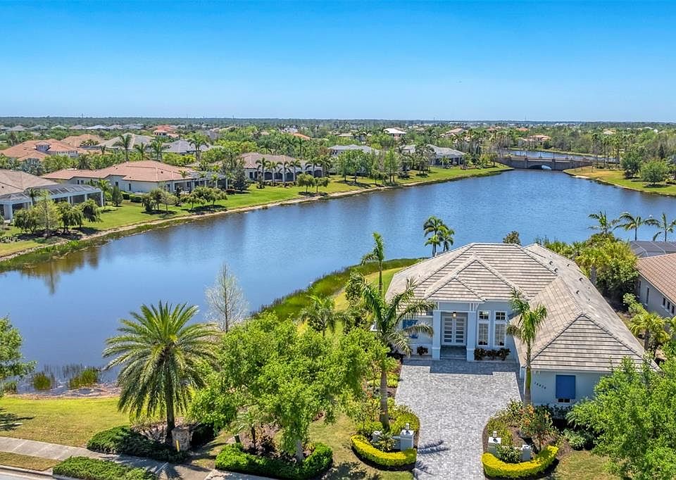 Welcome to your dream home, where over 170 feet of pristine lakefront offer breathtaking views from every angle! Whether you’re waking up to a serene sunrise or winding down with a colorful sunset, this stunning home promises unparalleled beauty. In the desirable Lake Club neighborhood, this custom-designed John Cannon coastal-style residence is the epitome of refined living. Upon arrival, you'll be welcomed by modern double white doors, leading into a light-filled entryway that opens up to a spacious great room and dining room. The open floor plan allows for a seamless flow between living, dining and kitchen areas, making it ideal for everyday living and entertaining. The gourmet kitchen features an oversized island, stainless steel appliances, large wine cooler, modern lighting and a spacious breakfast nook overlooking the pool. The conveniently located formal dining room offers a space for hosting memorable dinners. The expansive primary suite serves as a private retreat, offering abundant windows that overlook the pool and calming water views. The en-suite bath features a large walk-in shower, dual sinks and timeless white tile for a clean, sophisticated look. On the opposite side of the home, two spacious guest bedrooms share a well-appointed guest bath, offering privacy and comfort. A private home office provides the ideal space for remote work or a quiet study. Throughout the home, you'll find LED lighting and DC quiet ceiling fans, offering energy efficiency and comfort. The flooring is a harmonious blend of neutral tile and engineered hardwood, adding elegance and warmth to each room. Outside, the home offers an entertainer's paradise. The plentiful outdoor living space is highlighted by an outdoor kitchen, sunshades for comfort and tasteful lighting around the colonnade, creating an atmosphere for evening gatherings. The heated saltwater pool with sun-shelf is ideal for relaxation, and the smart-enabled heater system allows you to control the temperature with ease. A pool bath off the lanai ensures convenience for guests while enjoying the outdoors. Additional features of this exceptional home include hurricane-impact windows and sliders and a whole-home generator, providing peace of mind during power outages. The large laundry room is equipped with ample cabinetry, counter space, a washer, dryer and even a pedestal mini washer for smaller loads. The side-turned three-car garage provides an abundance of space, offering ample room for vehicles and storage, ideal for any car enthusiast. This custom coastal gem offers the ideal blend of luxury, style and functionality. Nestled in The Lake Club is an impressive 20,000-square-foot Grande Clubhouse, a hub of luxury amenities. Enjoy two pools, including a zero-entry pool with splash park, ideal for family fun. Indulge in poolside dining and unwind at the spa and fitness center offering guided workout classes, massages and facials by on-staff aestheticians. Sports enthusiasts will appreciate the tennis and pickleball courts with expert racquet pros available. Experience a vibrant social scene with a calendar filled with events. Inside the Grande Clubhouse, relax with billiards, pool tables, televisions, and game and card tables for various entertainment options. Don’t miss the opportunity to experience luxurious lakefront living at its finest.