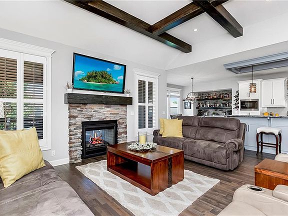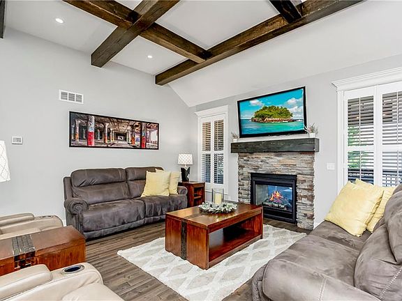 STUNNING Upgraded Custom built REVERSE 1 1/2 Story with AMAZING OUTDOOR LIVING SPACES! As you walk into this home you will love the soaring ceilings w/beams, wainscoting throughout the entry, and a feeling of spaciousness. As you peer into the great room, the custom hardwood floors and stone fireplace flanked by large windows will catch your eye. The great room opens to the kitchen that boasts upgraded honed granite countertops, walk-in pantry, stainless appliances, a vault over the island, and an added bar area with floating shelves, stone backsplash, and a built-in wine refrigerator. The Master Bedroom has a custom barn door to the bath and an elegant getaway exit to the screened porch w/see-through fireplace and TV entertainment area. In addition to the covered/screened porch, you walk out to an open 12x12 Grilling Deck. The stairs to the backyard lead to a paver pathway to a relaxing cozy fire pit area. The main level also has an extra bedroom with a full bath, linen closet, a laundry room with folding table and cabinets, and a large boot bench area off the kitchen with built-ins and a coffee bar. The 3 car garage is off of the kitchen w/boot bench area. When heading to the lower level, enjoy the u-shaped staircase with landing, wood end-caps & upgraded stair carpet. The lower level has 2 bedrooms and 2 full baths, a large rec room with daylight windows, and 2 ample storage areas. There is upgraded tile in every bath. The home has blinds or plantation shutters ready for you to move in. This home is located in the sought after Rodrock Development of Stonebridge. Stonebridge is a first class development with 4 swimming pools with playgrounds, a club house and gym, walking trails throughout, sport courts, and new pickleball courts. You are adjacent to the over 1,200 acre Heritage Park and Golf Course. The park includes a pond, dog park, party shelters, trails, and sports fields. Be the first to look and make this your new home!... so many extras!