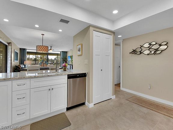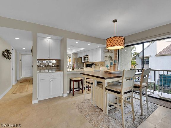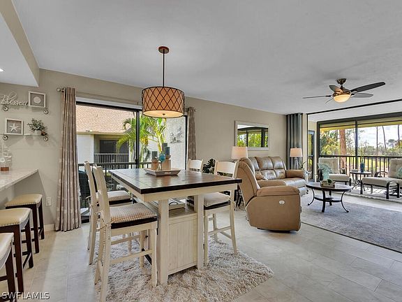 RENOVATED TURNKEY 2nd FLOOR END UNIT CONDO & HAD NO FLOOD DAMAGE FROM IAN! Situated in the intimate neighborhood of Dove Hollow in the gated golf community of The Forest. This condo is perfect for annual or seasonal living! This home offers a comfortable layout along w/ designer features in every room- great room design, spacious kitchen with a breakfast bar, high end quartz countertop, sun room/den w/ pocket French doors, dining area w/ sliders to lanai & custom bar, high-end light fixtures & fans, LED lighting, contemporary sliding (barn-style) door in master bedroom, quartz countertop on dual sink vanity in master bath, a long Florida room w/ porcelain tile flooring (replaced in 2019) and Custom acrylic sliders added to the Florida room. A/C was replaced in 2023 & water heater in 2019. Screens replaced in 2020. This home is just steps from the community pool and is just a short drive from the main gate. The Forest is a distinct golf community well-known in SWFL that offers a 36 hole championship course with private membership option, tennis, bocce ball, walking/jog paths, and so much more!