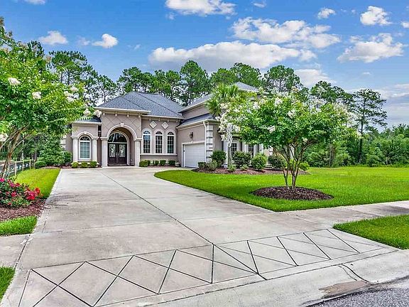 Enjoy this luxuriously designed home that is nestled directly on the Wild Wing Plantation Golf Course's No. 3 and No. 4 holes. This gorgeous home is the Conway "CP Quatterbaum Design Award of 2012 for Outstanding Construction of a Home. Enter into your front doors made of fiberglass dark walnut. Inside, there's 4 bedrooms, 2 bathrooms, upgraded engineered hardwood flooring, 12- and 14-foot ceilings and high-impact hurricane resistant windows, which provide an abundance of natural light and a custom tiled portico. The first floor master suite is a retreat with 12-foot Presidential ceiling (also in living room, dining room) a large walk-in closet, double trey ceiling, ceiling fan and a perfect view out your window of the golf course. The master bathroom is equally impressive with a large tub, dual sinks, granite vanities, a tiled shower with a frameless glass door and a water closet. The Chef's Kitchen has granite countertops, tile backsplash that gives the impression you are in an Italian Villa, upgraded 42-inch upper cabinets, under cabinet lighting, stainless steel appliances, a Delta Touch Technology faucet, upgraded pendent lights and a nook. The open floor plan features a living room boasting a double trey ceiling and an enlarged Carolina Room with extra windows installed to provide more natural light. This home is loaded with custom features such as Mediterranean style light fixtures in the foyer and dining room, double trey ceilings, upgraded fans and crown molding throughout and an attached custom 8' wall unit. The attached 2-car garage has a premium epoxy flooring, cabinets, work bench and a slide and lock storage system. Outside, the stucco exterior blends so beautifully with the impeccably landscaped grounds, which includes flower bed lighting. There's a 16x24 patio with concrete pavers that provides the perfect place for outdoor entertaining, the serenity of a romantic dinner or to just relax and soak in nature. This custom built house was strategically