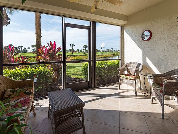 Park just outside in your reserved, covered carport and breeze into this spacious 1st floor condo. As you walk through the gracious entry, you'll immediately be captivated by the sweeping stretch of lake, golf course and breathtaking sunsets! This is what sets the tone for life in Kelly Greens. The kitchen has been updated with granite counters and a tumbled stone back splash with large, neutral tiles set on a diagonal through the living areas and lanai. The large master bedroom boasts a second sliding door to the lanai and two closets ( one which can be used as an owners closet for a buyer that is considering rented it out. Both baths have the same tasteful ceramic tiles and granite counters and updated lighting. This is one of the low density clusters of condominiums with only 3 buildings sharing the pool, hot tub, bocce, tennis and pickle ball courts. The AC was replaced in 2017, the lanai has electric hurricane shutters and the master bedroom has manual shutters. Kelly Greens has an excellent restaurant, bar and a great staff. The clubhouse hosts many events including entertainers, trivia night and special dining events.