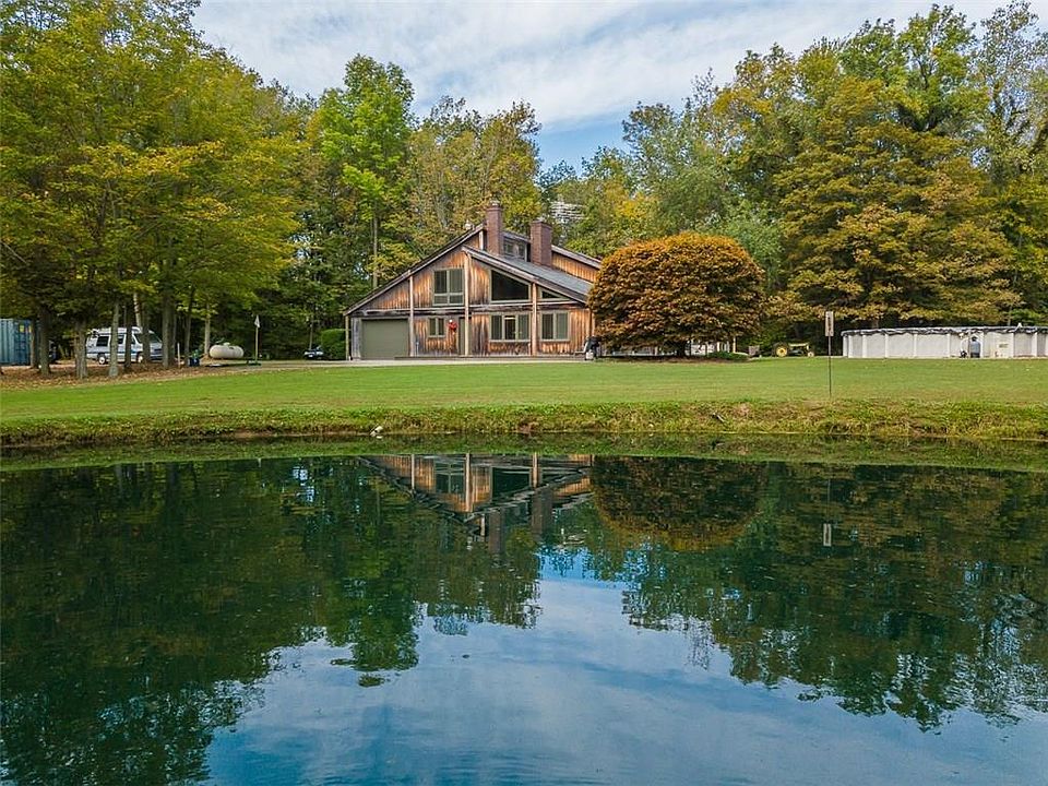 Very lovely unique one owner home situated on 7+ private acres*Home features 3 bedrooms, 2 bathrooms, large great / living room w/ vaulted ceiling, wood stove, & w/ second floor balcony*Garage is insulated and heated ( owner used as wood shop)*Great stocked pond in side yard, heated above ground pool, dog kennel attached to garage, creek runs along property with woods and trails*as the pictures show, a beautiful park like setting* The owners have enjoyed living here since they built the home in 1976*