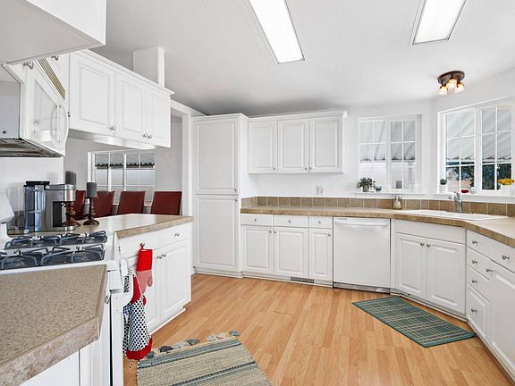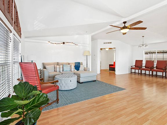 This 3bd/2ba home has a large front porch where you can sit and enjoy the cool ocean breezes any time of day. This home has an open floor plan with a nice sized kitchen and lots of cabinet space with an eating area off to the side. The large living and formal dining rooms are located right off the kitchen and perfect for entertaining. The double doors from the living room area leads into the first bedroom which can also be used as an office. The laundry room, guest bedroom and bathroom follow down the hallway with the large master bedroom and master bathroom at the very end of the home. The master bedroom has a large walk in closet. There's a door with a screen door that leads to a small enclosed side yard which is perfect for your pup to come and go in and out of the house. The master bath is quite large with double sinks, a large walk in shower and plenty of cabinets for storage. There's lots of natural light coming into this home making it light and airy. There's laminate flooring through the home and a ceiling fan in each room, 5 total. This lovely home is located in a very desirable part of Huntington Beach in Skandia Mobile Home Park. It's walking distance to restaurants, shops, banks and only 5 minutes to the beach. The seller is very motivated so call Patti to see this beautiful home priced to sell!