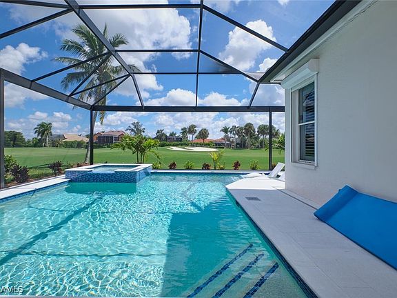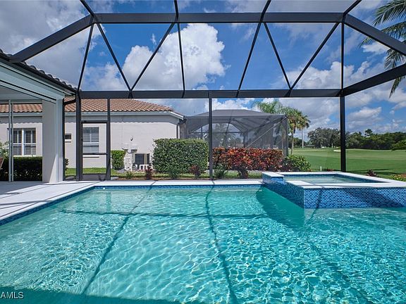 Location, Location, Location! Awesome view of the 17th hole & fairway! Lots of privacy with the golf cart path located on the other side of the fairway. The garage is an extra 4' deep and fits 2 cars and a golf cart. There is also a side service door in the garage. This single family Golf Village "Mayfield" villa home has been totally updated in the last 2 years. Brand new salt water pool with sun ledge & spa with new sand blasted white marble flooring around pool in 2024. New Bronze pool cage with picture window screening in 2024. Control the pool settings with an app on your phone or manually with a control pad in the home. New roof in 2023. French doors leading to the lanai. Outside of home was professionally painted and landscaped in 2024. New cabinets & Quartz counters with waterfall. New bar in the kitchen with Quartz top as well. New white porcelain flooring in great room, kitchen, office and hallway. New ceiling lights. New bathroom cabinets with Quartz counters, ceiling lights, light up mirrors & new shower doors. Interior of home painted in 2023. New interior doors & moldings in 2023. Plantation shutters. Electric hurricane shutters. Built in cabinets in 3rd bedroom and so much more. This home has it all.
