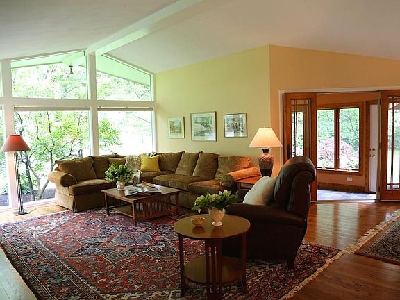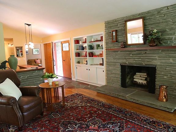 Be First! Chirping birds, colorful flowers & ornamental trees set the stage for this meticulously maintained, move-in ready, contemporary ranch. The light-filled cathedral ceilinged living room with woodburning fireplace, pegged oak floors & built-in bookcases flows to the dramatic dining room for easy entertaining. The sunroom, overlooking the lush landscaped yard, invites nature inside. The eat-in kitchen with granite counters, peninsula, & new appliances delight. The study/possible third bedroom features custom bookcases. A romantic master bedroom suite with picturesque windows & updated bath will wow you! The glamorous oversized garage with $15,000 in renovations complete this elegant abode tucked on a private lot with inspirational outdoor living space/slate patio.
