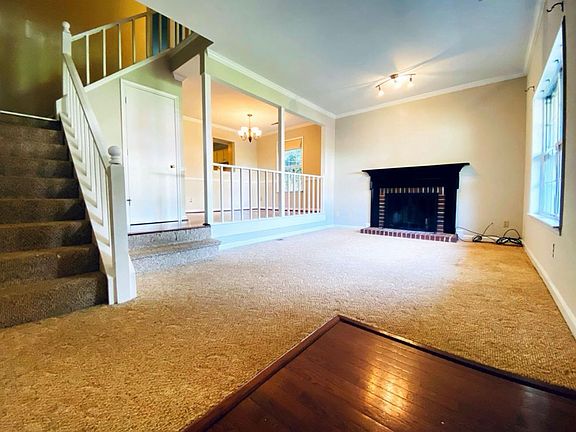 This two story, end unit townhouse is every bit as inviting as it looks! Enter into the sunken, carpeted living room with handsome brick hearth fireplace topped with black mantle. Continue up two stairs to the dining area that looks over the living area. Dining area has rich, dark stained hardwood floors and chair railing. Kitchen just off dining area features tiled floor, stainless steel appliances, tons of cabinet space and quaint service window through to dining area. Yellow cabinets have been updated and a movable island was added to increase counter space. Large utility/laundry room off kitchen with shelving for storage. Half bath on ground floor. Second floor offers three bedrooms including spacious master with large closet. Secondary bedrooms off hall. All bedrooms are comfortably carpeted and each have ceiling fan. Master bedroom and hall open to Jack and Jill style bath, with half baths with sinks and vanities immediately accessible and bathing area separating the two half baths. Convenient for when two people need their own areas to prepare of the day! The kitchen walks out to the brick patio area that will be sure to see plenty of use! Lovely walking trail right behind home! Lawn mowing included with rent. Up to three pets allowed with 250 non-refundable pet deposit. Negotiable pet terms based on individual pets.