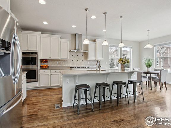 Welcome to your oasis of luxury nestled within the prestigious Renaissance community of Longmont. This stunning residence exudes sophistication and comfort, boasting an array of upgrades and thoughtful features throughout. As you step inside, be greeted by the warmth of Hickory hardwood floors that span the main floor, leading you through past an inviting office space with elegant French doors and a formal dining area complemented by a convenient Butler's pantry.The heart of the home awaits in the gourmet kitchen, where culinary dreams come to life amidst double ovens, an eat-in area, and ample space for gatherings. Adjacent, a spacious and open floor plan unfolds, centered around a cozy gas fireplace, perfect for cozy winter evenings. For added convenience, a main floor bedroom and bathroom offer flexible living options, ideal for guests or multi-generational families.Step outside to the custom stamped concrete patio, where entertaining guests or enjoying al fresco dining becomes a delight. Upstairs, discover a sanctuary of comfort with additional bedrooms and bathrooms, including a lavish 5-piece primary bath and expansive walk-in closets. A loft provides versatile space for relaxation or recreation, catering to your every need.Meanwhile, the unfinished basement presents endless possibilities, featuring a rough-in for an additional bathroom and an active radon system, ready to be transformed into the ultimate retreat or entertainment area. Enjoy breathtaking views of the majestic Rocky Mountains from the front yard and upper loft window, while you have easy access to hiking, biking, lakes, and trails beckons outdoor enthusiasts. With the flatirons of Boulder just a short drive away and convenient access to Hwy 119 and I-25, this location offers the perfect blend of tranquility and accessibility. Don't miss the opportunity to experience the epitome of Colorado living - schedule your showing today!