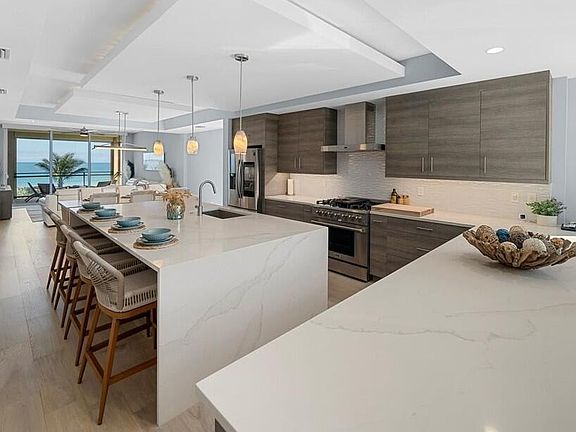 DIRECT Oceanfront 4 BR 4 BA Plus Den Residence with Private 2 Car Garage. This SPECTACULAR residence feels like a PRIVATE Oceanfront Home as it takes up the entire floor of the building. Direct lobby access from your private 2 Car Garage. Secure elevator takes you to your private vestibule entry. So many luxurious features with Wood Flooring, Ceiling Treatments, Quartz Countertops, Gas Range, Custom Cabinetry, and an Owners Suite to rival the best resorts. The spacious oceanfront terrace provides outdoor living and dining. All the doors and windows are impact rated plus there are automatic storm shutters on the ocean terrace providing additional protection. The guest wing is separate from the main living areas providing privacy for all. Windows all have automatic, remote control blinds for privacy. Resort style grounds with a Ocean View Gym with Tonal system, a Sauna, Heated Pool, Spa, Summer Kitchen, and Private Beach Crossover. Come live the luxurious beach life!