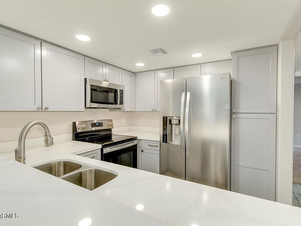 Beautifully completed remodel in centrally located area. Kitchen boasts quartz countertops, stainless appliances including large refrigerator, gray shaker cabinets with knobs/pulls, stainless sink, Master bath walk in showers, tile enclosure, new vanity. Hall bath with tub & tile enclosure, new vanity. All new tile floors t-out, neutral carpet in bedrooms, fresh paint, new windows & slider, new interior doors, lighting fixtures & ceiling fans. New A/C unit, new plumbing in walls & fixtures. Community has large pool plus access to Dobson Ranch amenities.