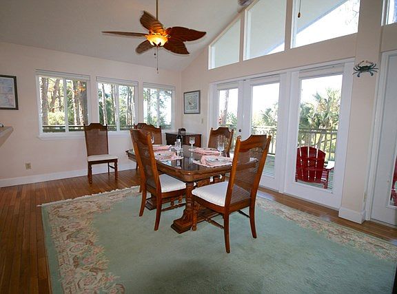 Spend your days under the natural wooded canopy, soaking up the panoramic water view from this beautiful island tree house! Beautiful wood floors run throughout this open floor plan home. Sky-high cathedral ceilings and lots of windows bring the lovely coastal outdoors into your living space! This home has lots of features to make your playtime easy: a boat dock, boat lift, and boat launch mean that Gulf of Mexico fun is right at your fingertips! Entertain friends in the generous great room, or head outdoors to the sprawling deck overlooking the saltwater. Stow your water toys in the garage with extra-large door. There's a convenient half bath at ground level, too. Lots of extras make this well-equipped home a rare treasure!