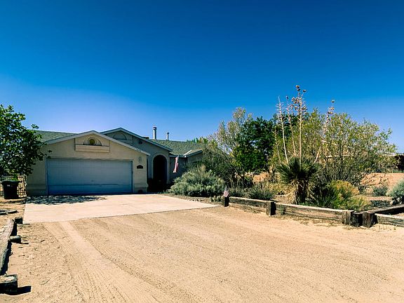 Single story home on 1/2 acre lot with views of the Sandia Mountains and Albuquerque city lights at night. Open floorplan with neutral colors, vaulted ceilings, skylights, two living areas, dining room. Wood burning fireplace in family room. Kitchen has breakfast nook with bay window, pantry, gas stove/oven, refrigerator. Three bedrooms and two full baths. Private backyard has tiered garden, water feature, covered patio with flagstone extension, backyard access. Southwest gravel front landscape. Oversized, finished two car garage. New septic tank installed August 2015. New pump, motor and control box on well installed August 2015. Propane tank is owned.