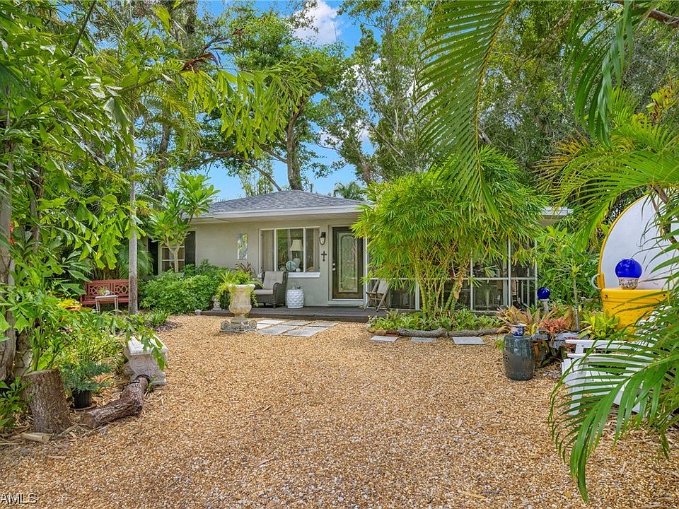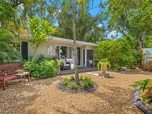Once In A Lifetime! Step into a Master Gardener's private oasis. Charming Furnished Cottage nestled among exotic tropical landscaping & finished mature gardens. Start in extensive back garden. Many plants from historic Edison gardens dot this peaceful place. From patio by new hot tub wander winding river rock paths & discover 13 sitting areas, 4 ft cobalt fountain, bird baths, gazing balls, etc. Gardens designed to attract butterflies all year. Large shade tress create dappled light all day. Trees include olive, mt laurel, coconut, mango & guava. Four types of bamboo trees (black, green, yellow & blue) grace the gardens. Enjoy dramatic exterior evening lighting - perfect for entertaining. Sheds for tools, outdoor h/c shower for gardener. The house has new roof & is move in ready. Welcoming front porch & graceful entry door to living room, tidy kitchen, 2 bdrms, luxe bath (light features colors, light & sound). Thru French doors is updated screened porch for al fresco dining. At front is the grandkids favorite place; a Teardrop Camper from Germany. Lt weight w ac/fridge, table & sofas convert to queen bed for sleepovers. Close to shopping, dining & River District. Owner financing!