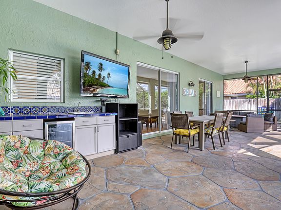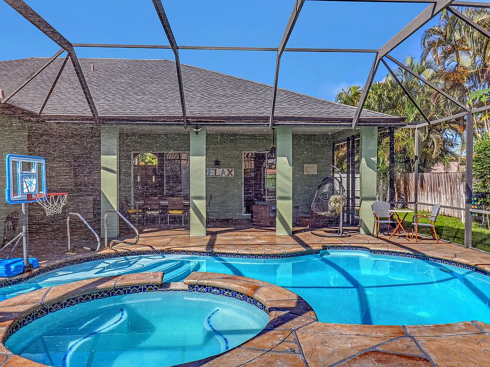 The exterior of this home is a haven for relaxation and entertainment. A large outdoor covered patio area invites you to unwind, while the caged pool and spa, each heated separately, promise year-round enjoyment. The outdoor bar and kitchen, complete with a small fridge, are perfect for hosting gatherings, enhanced by outdoor ceiling fans that ensure comfort on warm days. The property boasts a new roof installed in 2016, an HVAC system from 2013, and gutters added in 2018, reflecting meticulous upkeep.