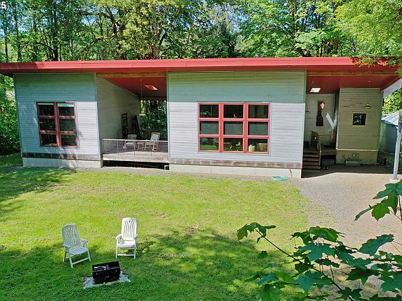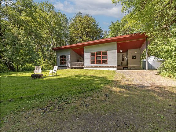 Architect-designed modern retreat with attached artist studio (or guest room/home office) on over six wooded acres with 825 feet of Upper Nehalem River frontage in the high valley of Oregon’s Coast Range. Constructed with foot-thick Aerated Autoclaved Concrete for exceptional insulation and durability, this one-of-a-kind 1354 square foot home features American Clay interior finishes, custom sliding barn doors crafted from local wood, and handcrafted maple-root accents throughout. Enjoy a cozy wood stove, a two-person sauna, and a spacious covered deck with tropical hardwood decking and a granite dining table—perfect for entertaining or quiet reflection. The land includes a shaded meadow ideal for gatherings, a fire pit, or relaxing in a hammock. Multiple storage sheds, two RV electrical hookups, and room to park give many options to enjoy the outdoors. Meandering riverfront trail to enjoy river floats and campouts on your private piece of Pacific Northwest beauty. Wildlife abounds with seasonal salmon runs, elk sightings across the river, and the sounds of owls at dusk. Pure drinking water is supplied directly from Oregon rainfall with a drilled well as a second option. All of this is just 40 minutes from Intel, Nike, and other major tech hubs, offering the perfect balance of seclusion and accessibility. Five minutes to historic Vernonia where all the basic necessities of small town living are available as well as local shops and restaurants, Vernonia Lake, Linear Trails and several community events. Come enjoy your own private piece of nature and small town living today!