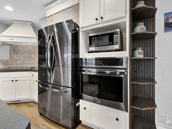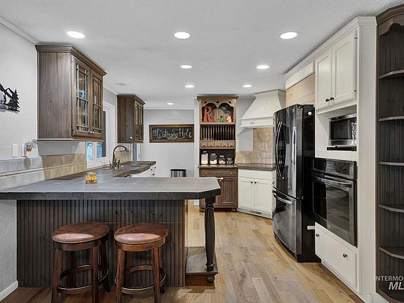 Perched atop a scenic hill in Caldwell, this stunning 5-bedroom, 3-bath estate offers 1.8 acres of breathtaking beauty, giving you unmatched panoramic views. With 2,980 sq ft of updated living space, this home blends comfort & functionality—featuring two fireplaces, a spacious main-level master suite, & a modern kitchen complete with a breakfast bar, built-in oven/range, and pantry. Step outside to experience the ultimate equestrian lifestyle. Your pasture sits directly below the home at the base of the hill, providing an ideal setup for your horses, complete with horse stalls. The property also boasts full perimeter fencing, RV parking, an attached garage, & a garden space, making it perfect for those who crave space and serenity. Relax on the covered patio & deck, soaking in the idyllic country views, while enjoying the peace & privacy of hilltop living. Conveniently located near schools & public roads, this property combines the best of rural charm with modern upgrades.