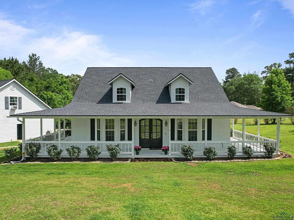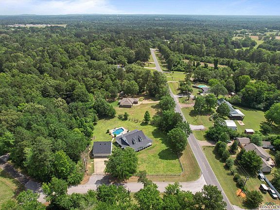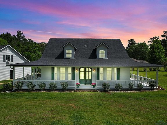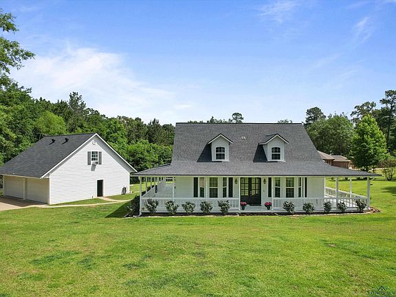 Welcome to this beautiful two-story, 3-bedroom, 3.5-bath home situated on a peaceful one-acre lot in Gladewater, Texas! This well-maintained residence offers both comfort and functionality, featuring a spacious open concept living area, a modern kitchen with updated appliances, and a cozy dining space perfect for gatherings. The home has the master bedroom downstairs with his and hers bathrooms that are connected to a large walk-in closet that then joins the laundry room for convenience. There are two bedrooms upstairs, a full bathroom and a large common area that can be used as a game area or additional hangout. A convenient half-bath is located on the main floor for guests and space set out for your pets to retreat to under the stairs. Car enthusiasts and hobbyists will love the expansive garage, which offers plenty of space for vehicles, storage, or workshop needs along with a half-bath. Above the garage, you'll find fully-equipped guest quarters—ideal for extended family, visitors, or potential rental income that adds an additional 736 square feet of living space. Outside, find your own private retreat with a sparkling in-ground pool, perfect for entertaining or enjoying warm Texas afternoons. Surrounded by open green space and a wraparound porch, this fenced, one-acre property provides the perfect blend of comfort and outdoor living. Don't miss the opportunity to own this versatile and inviting home just minutes from local schools, shops, and the charm of downtown Gladewater.