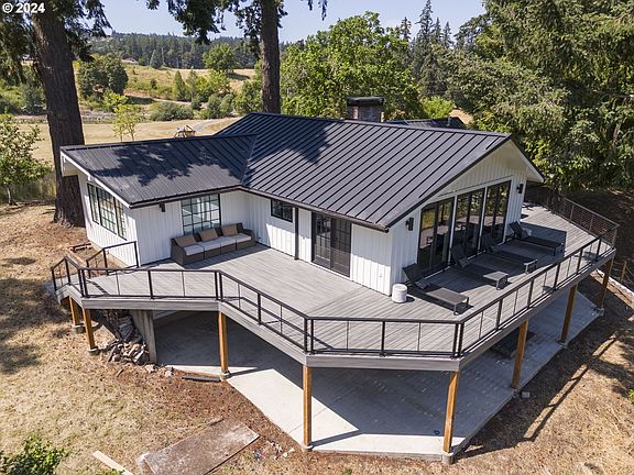 Spring price improvement and freshly paved driveway! Introducing The Farmhouse! A picturesque, riverfront property on 6.02 acres. The Farmhouse has been remodeled top to bottom, with no detail spared. The gabled roof, wrap around deck and vaulted ceiling support the traditional farmhouse feel, but with an updated contemporary twist. Upon entering the home you are drawn to the great room that is surrounded by French doors and flooded with natural light. This open concept also boasts vaulted ceilings and a brick, woodburning fire place. Whether you are lounging on the couch, eating at the table, or cooking in the kitchen, the Willamette river views and natural light will make even the most mundane task enjoyable. Three bedrooms are on the main floor, including the primary suite. Downstairs features unique epoxy finished concrete floors, a family room with another woodturning fireplace, beamed ceilings, and two French doors leading to the lower patio. The bunk room, bathroom suite and laundry room can also be found in the daylight basement. Other features include School House Electric light fixtures, House of Hackney wallpaper, JeldWen windows, Cle Tile, Waterworks faucets, and a custom milk glass chandelier, inspired by the homes original finishes. The exterior of the home within its sprawling 6 acres includes a pond with a deck suitable for furniture or a teepee, play structure, extra deep hot tub and a two story dock. Offering a little something for everyone, without leaving the comfort of your own home! There is also a finished, 14X18 shed with plumbing and electrical that could be used for hobbies, storage, or a personalized space to hang out. The private gate and acreage offers both privacy and security while only a quick 10 minutes from Wilsonville and only 20 minutes from Newberg and wine country. Don't miss out this unique opportunity to own a slice of riverfront paradise!