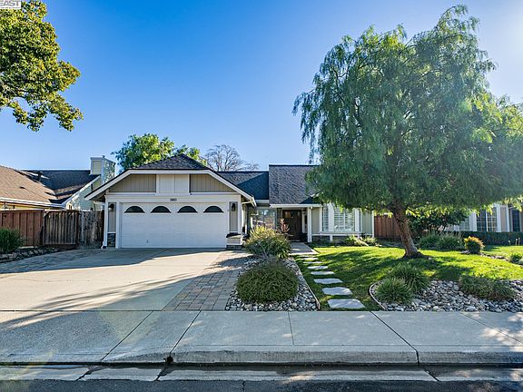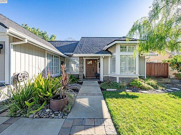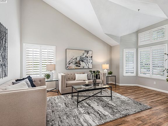 Gorgeous single level home in Livermore that you don’t want to miss! This immaculate 4 bed 2 bath is turn-key with designer touches from head to toe! Neutral flooring & paint throughout are accented by exceptional natural lighting & multiple high vaulted ceilings. Kitchen is updated with dark countertops, white cabinets, & white subway tile backsplash. Stainless steel appliances & bar top seating finish this space. Family room is completed with conventional fireplace, custom shutters, & backyard access. Main bedroom suite is dreamy with extra-tall vaulted ceiling, dual bath granite vanity, including extra-large shower & walk-in closet. Backyard is ready for hosting with adorable black pergola covered patio, finished fire pit seating area, & cozy grass yard. Side yard is wide with space for outdoor storage!