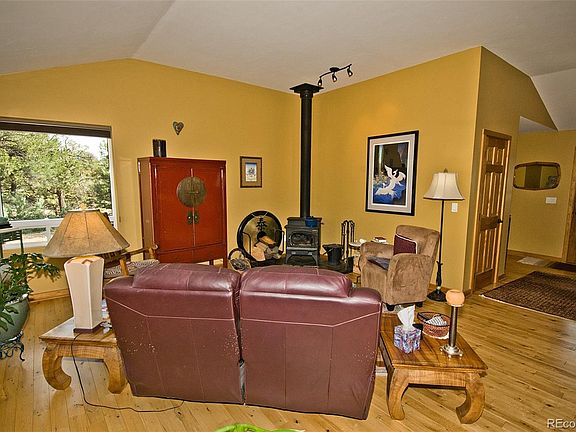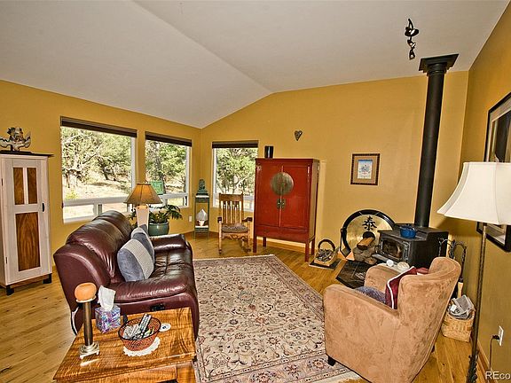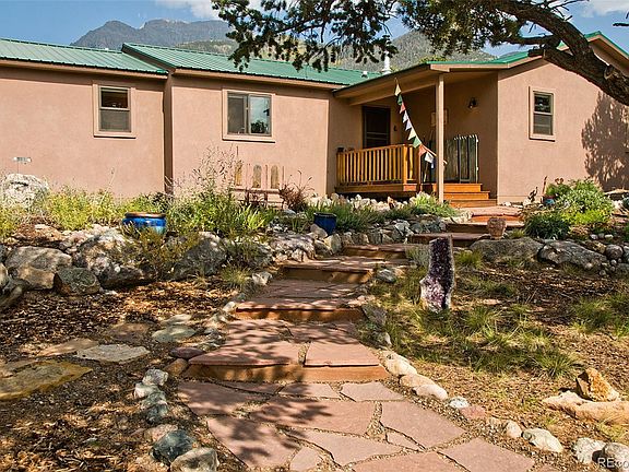 Exquisitely-maintained 1760sf 3BD/2BA rancher in a private location backing to greenbelt, just off paved road with convenient access to town. Nestled on 1 acre among Juniper and Pinon trees, this home has beautiful views of the Sangre de Cristo Mtns and San Luis Valley. Via the covered porch, enter into the front hallway with ample closet/storage space. The bright and spacious Great Room features plentiful mountain-facing windows and lots of space for living and dining. The Living Area features a corner wood stove for cozy winter heat. Rich wall colors and white oak hardwood floors create a warm inviting interior space. Off the Great Room is the bright, well-designed Kitchen, featuring pantry, granite-tile counters, hickory cabinets, large island, and stainless appliances. Off the north end of the Great Room is the very large Master Bedroom, with mountain views, a large walk-in closet and custom full Bath. Blinds are up-down, allowing for both privacy and views. The two Guest Bedrooms and full Bath are thoughtfully located at the other end of the house, creating separation and privacy for all. All Bedrooms are carpeted with electric baseboard heat. The Great Room features a large and efficient ETS wall heater, along with the wood stove. Off the back of the Great Room are sliding doors to a cedar wood deck. The grounds feature landscaped paths, gardens with drip irrigation, a flagstone patio to the west and private seating areas under the trees. The exterior is rounded-out by an attractive circular gravel drive and storage shed. Low-maintenance stucco exterior and metal roof. Great opportunity for well-designed single-level living in a private but convenient part of the Baca Grande, with access to Walking, Hiking, Camping, Birding, MTB, Rock Climbing, Hot Springs, Hunting and more in the San Luis Valley area. All that with the amenities of Crestone - groceries, cafes, restaurants, post-office, hardware, etc - only 10 minutes away by car. Call for more information!
