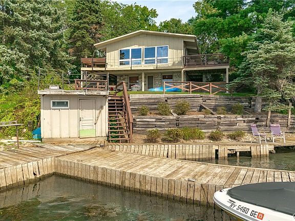 Fabulous waterfront ranch on a quiet street just outside the village and close to marina! Property offers 3 bedrooms, 2 of which are en-suites, and 3 full baths. Totally open living space w/a river-view, including a peninsula kitchen w/room for seating, large dining space and living room. Living room features a statement floor to ceiling stone gas fireplace, and a gorgeous tongue & groove cathedral ceiling. Enclosed porch off the living space w/a wall of windows, as well as two side porches; one screened in, the other open. Regardless which porch you’re sitting on, the views don’t disappoint! Lower level offers additional living space/storage. Massive 2 finger dock. Detached garage w/finished upstairs living and bathroom. Situated in a protected bay for safe docking and fabulous fishing!