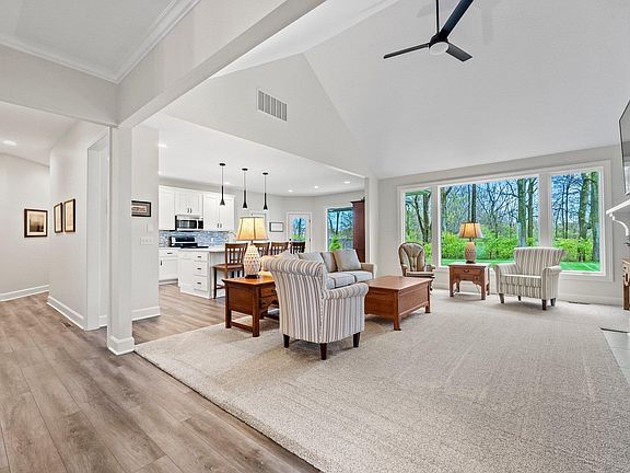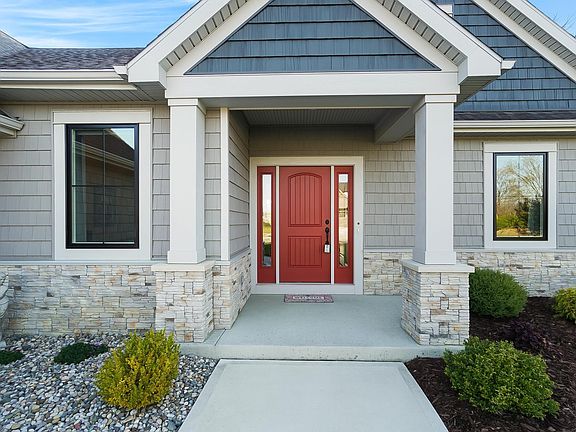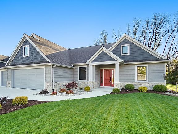 Come and see this hand crafted and beautifully designed single story Bob Buescher Home, built in 2019. As you approach the home, you will immediately appreciate the beautiful yard and meticulous landscaping, complete with irrigation system. This elegant open concept home features 3 bedrooms, 2 bathrooms, an office/den, rear covered porch with additional open patio, and a 3 car garage. As you enter the foyer you'll be drawn to the peaceful wooded view, which is captured by the large glass pane windows located in the great room and dining area. The home is filled with natural light and stylish selections, along with new carpet in the great room and primary bedroom. Your custom kitchen features hand crafted cabinets by Zehr, oversized 5X8 island with storage, quartz counter-tops, an abundance of cabinet space, and a walk-in pantry with coffee bar. The great room adjoins with the kitchen and dining area, and boasts a cathedral ceiling, with an attractive fireplace. Tucked away for a private retreat, the primary bedroom suite displays a 9' high ceiling with crown molding and a spa like primary bathroom, complete with a tile walk-in shower, oversized walk-in closet, a double vanity with quartz top, private water room, and a transom window for extra lighting. Bedrooms 2 and 3 are generous in size. This home is located in The Quarry, with easy access to I-69, Parkview, walking trails, shopping & restaurants.