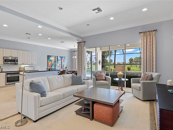 The updated kitchen boasts stainless steel appliances and complements the open floor plan, allowing for seamless entertaining and socializing. The main living area features exquisite crown molding, adding a touch of elegance to the space. This home comes with a range of desirable upgrades, including a new roof, water heater, and solar panels for the pool, ensuring energy efficiency and cost savings. Step outside to the covered lanai, ideal for hosting gatherings or enjoying outdoor dining. The pool overlooks a picturesque water and golf course view, offering a serene and breathtaking backdrop. Located in close proximity to Sanibel, Ft Myers Beach, restaurants, and RSW, this home offers the convenience of nearby amenities while providing a peaceful retreat. Schedule a showing today and experience the epitome of Florida living.