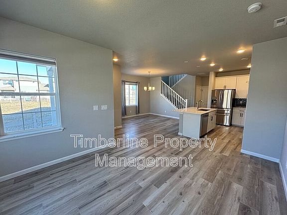 Corner lotStainless steel appliancesGorgeous front range mountainsModern kitchenLarge kitchen islandOpen concept living spaceSmall green belt