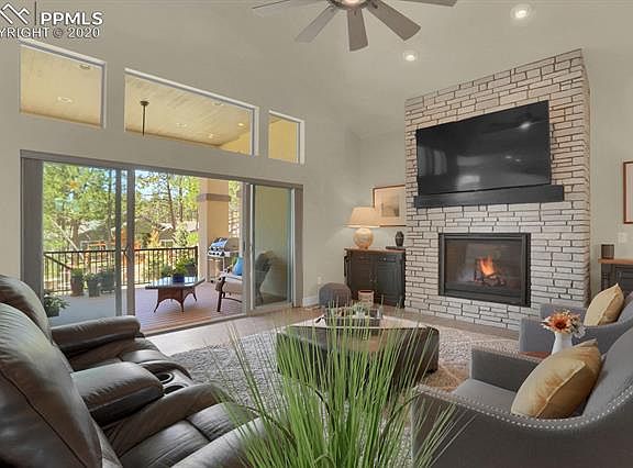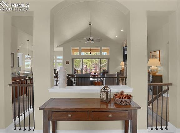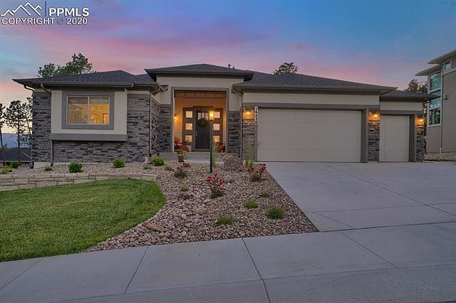 ~WELCOME HOME~. This beautiful home surrounded by trees and views, sits on just over 16,000 sq ft, located in the beautiful community of Sanctuary Pointe. Enter into the gourmet kitchen which has a 36 inch gas cooktop, oven, convection oven, Kitchen Aid appliances, soft close drawers and doors. Upgraded lighting, Level F quartz countertops, window coverings, and floors throughout the main level with a floor to ceiling gas fireplace. The main level includes front office/bedroom, large laundry room with storage closet, cabinets, and quartz countertop. Spacious master bedroom with walk in closet, double vanities, and a soaking tub and separate shower. Downstairs you will find 9ft ceilings, upgraded wet bar with wine fridge, separate sitting area, and gas fireplace. Upgraded junior master suite with 3/4 bath, quartz countertops, and walk in closet. 2 additional nice size bedrooms with walk in closets and Jack and Jill bathroom. An additional 1/2 bathroom make for a total of 3 bathrooms in the basement. Oversized 3 car garage with service door and refrigerator that stays. ****Now for the moment you have been waiting for. Your backyard oasis has it all. Professionally designed rock waterfall feature, gas fire pit *with views* for s'mores and those chilly fall evenings, landscape lighting, and expansive stone patio (approx 625 sq ft) for entertaining. Large 15'x19' covered deck (with ceiling fan) for enjoying that morning cup of coffee, while listening to the sound of the trees swaying in the breeze. Gas bib added for grilling! Decorative split rail fenced yard on all sides. This gorgeous home really has it all. Sanctuary Pointe is adjacent to the highly sought after Fox Run Park, with many trails, dog park, playground, and picnic areas. Close to shopping and easy access to I-25.