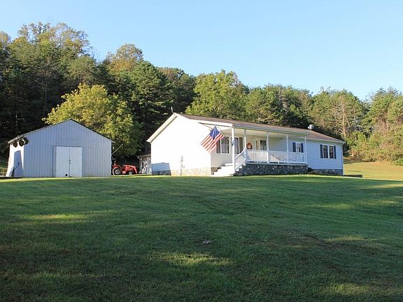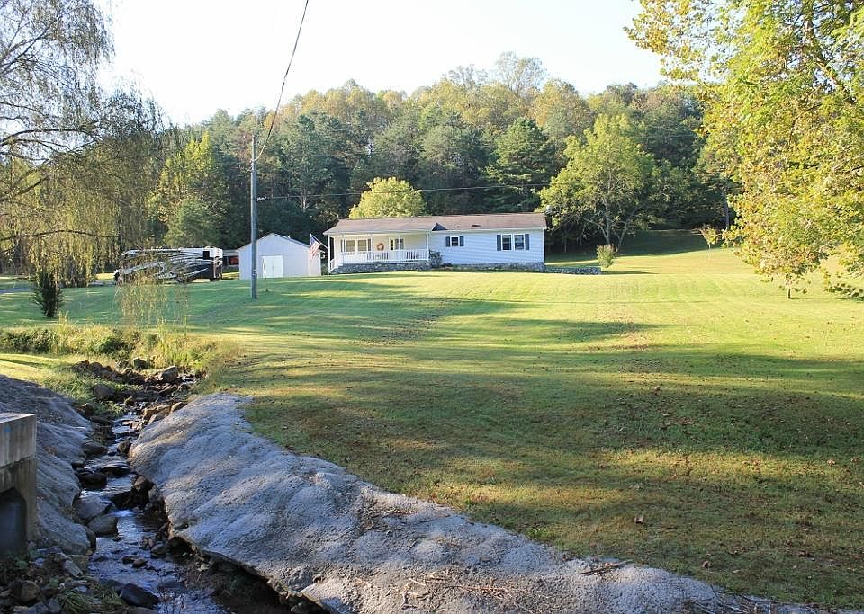 Three Bedroom Ranch nestled in the valleys of the Blue Ridge Mtns. Half a mile from Blue Ridge Parkway and USFS land. Three bedrooms, two bath, sun room, eat-in kitchen, pantry, and open living area. Three car attached garage, detached garage, carport, paved driveway, and full walk out basement with woodstove. Pleasant small stream on the property.