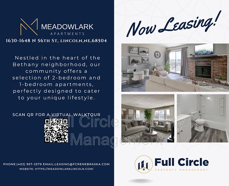 Welcome to Meadowlark Apartments, our community offers a selection of 2-bedroom and 1-bedroom apartments. Select units come with stone fireplaces, and or balcony. Pet-Friendly: At Meadowlark Apartments, we believe that pets are family too. Unbeatable Location: With easy access to UNL's East Campus and Wesleyan. Walk to nearby shopping plazas and dining or on to campus. Hope to see you soon!
