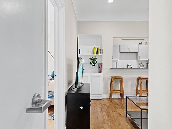 The open floor plan seamlessly connects the living and dining areas, creating an ideal setting for both relaxation and entertaining. Dont miss the hidden storage area behind the shelving unit!