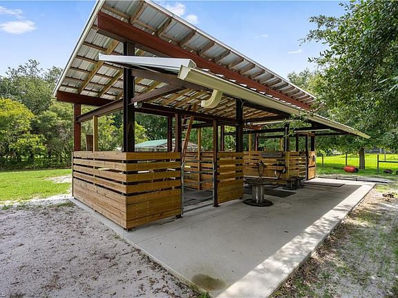 Just reduced!! GREAT VALUE!! Bring your horses to this wonderfully manageable 2.5 acre ranch property! House has 3 bedrooms, 2 baths, and an oversized 2 car garage all in excellent condition! Large screened lanai 12' X 50'. Hot Tub is included in lanai. Plenty of room for a pool and has been pre-wired. Home is also generator ready. Property includes a new 2 stall barn with water and gutters, chicken coop, and 3 additional storage sheds. There is also a like-new double wide carport with sides for trailers and other vehicles. All crossed fence pastures for convenience with multiple gated access points. House has county water and all irrigation is supplied by well. Convenient to Bayshore, I-75 and shopping. This property offers a perfect blend of seclusion and convenience!